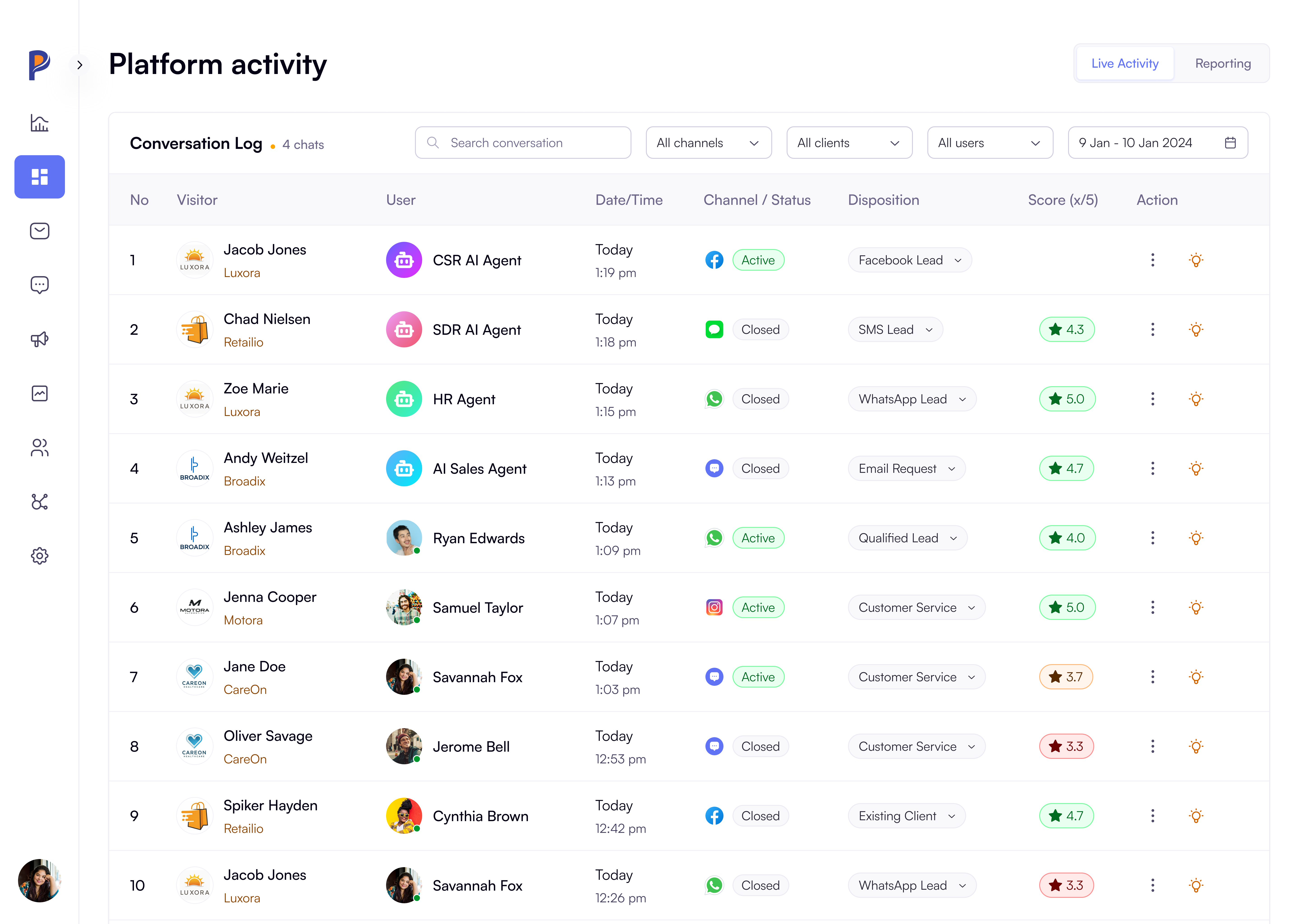 AI agents and human agents are often measured using different data sets. Palera compares performance across both using the same continuous conversation record. This creates fair benchmarking and highlights where automation or human handling performs best.