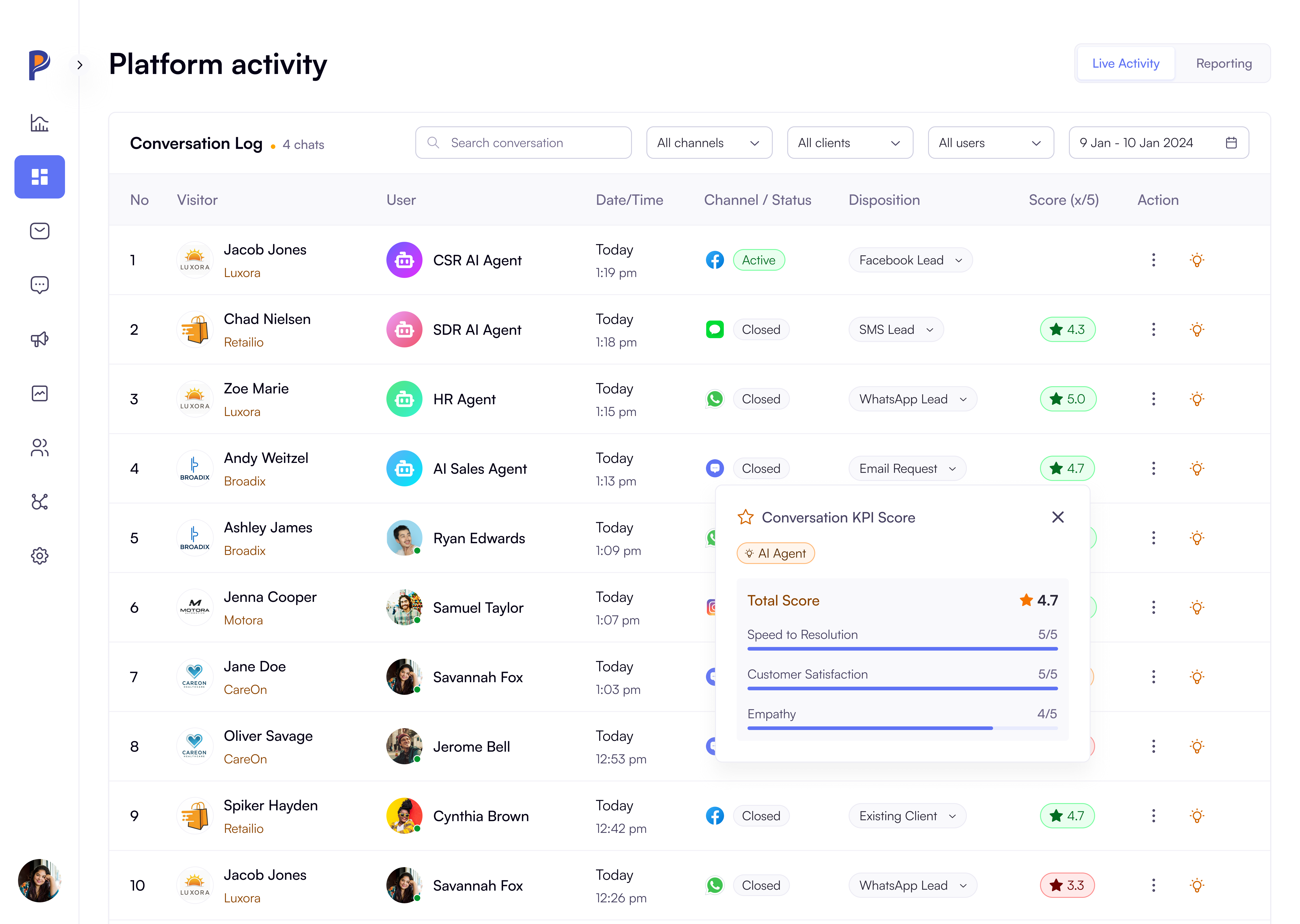Many analytics tools measure tickets or messages in isolation. Palera analyzes complete conversations across channels and handoffs to reveal patterns, outcomes, and operational trends. Leaders gain a clearer picture of performance across both AI and human handling.